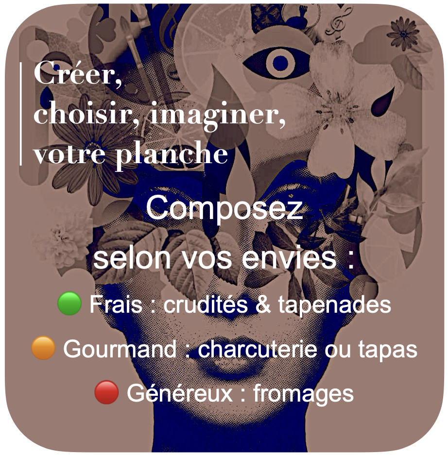 A midi : Créer, choisir, découvrir, maitriser, votre repas Le soir : Créer, choisir, imaginer, votre planche